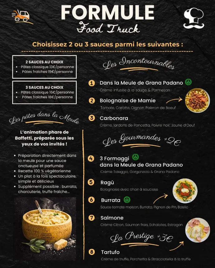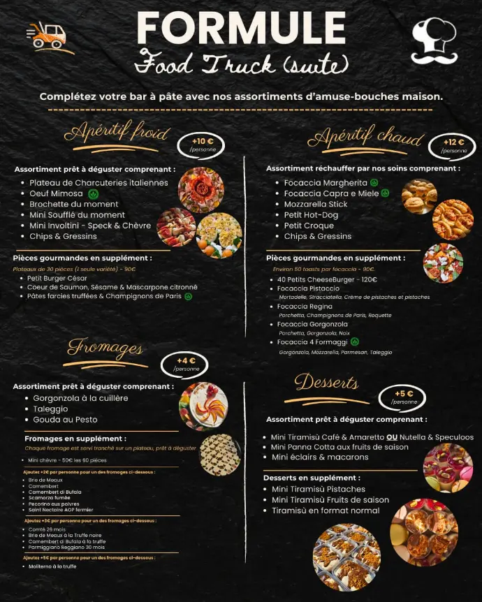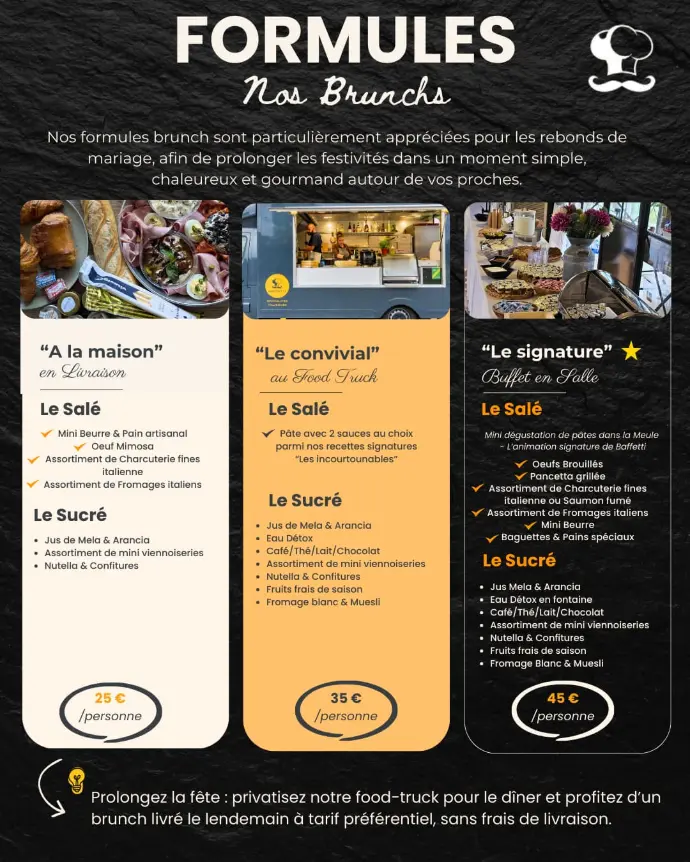 - Brunchs à 35€ et 45€ : disponibles en food truck uniquement.